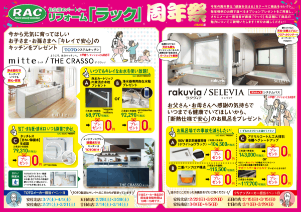 さらにTOTO・クリナップ両メーカーの担当者が週末土曜・日曜日にリフォーム「ラック」各店にて直接商品についてご説明するイベントも!