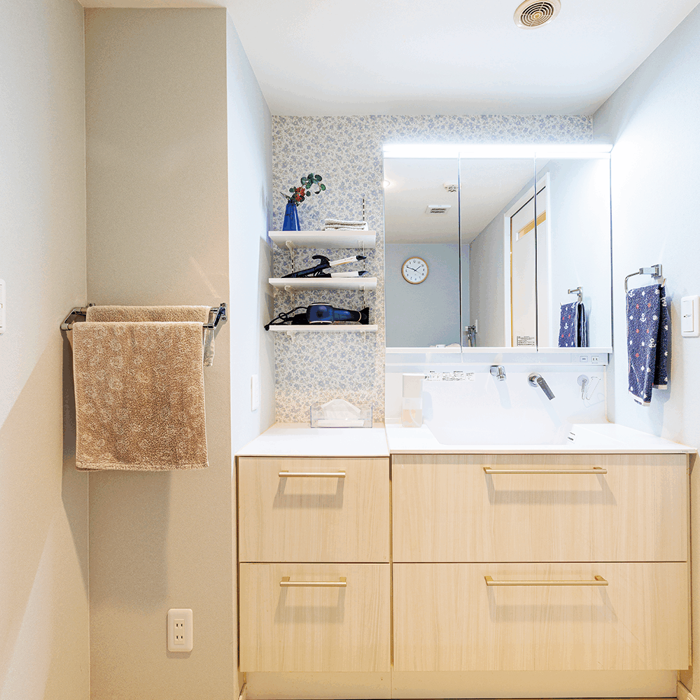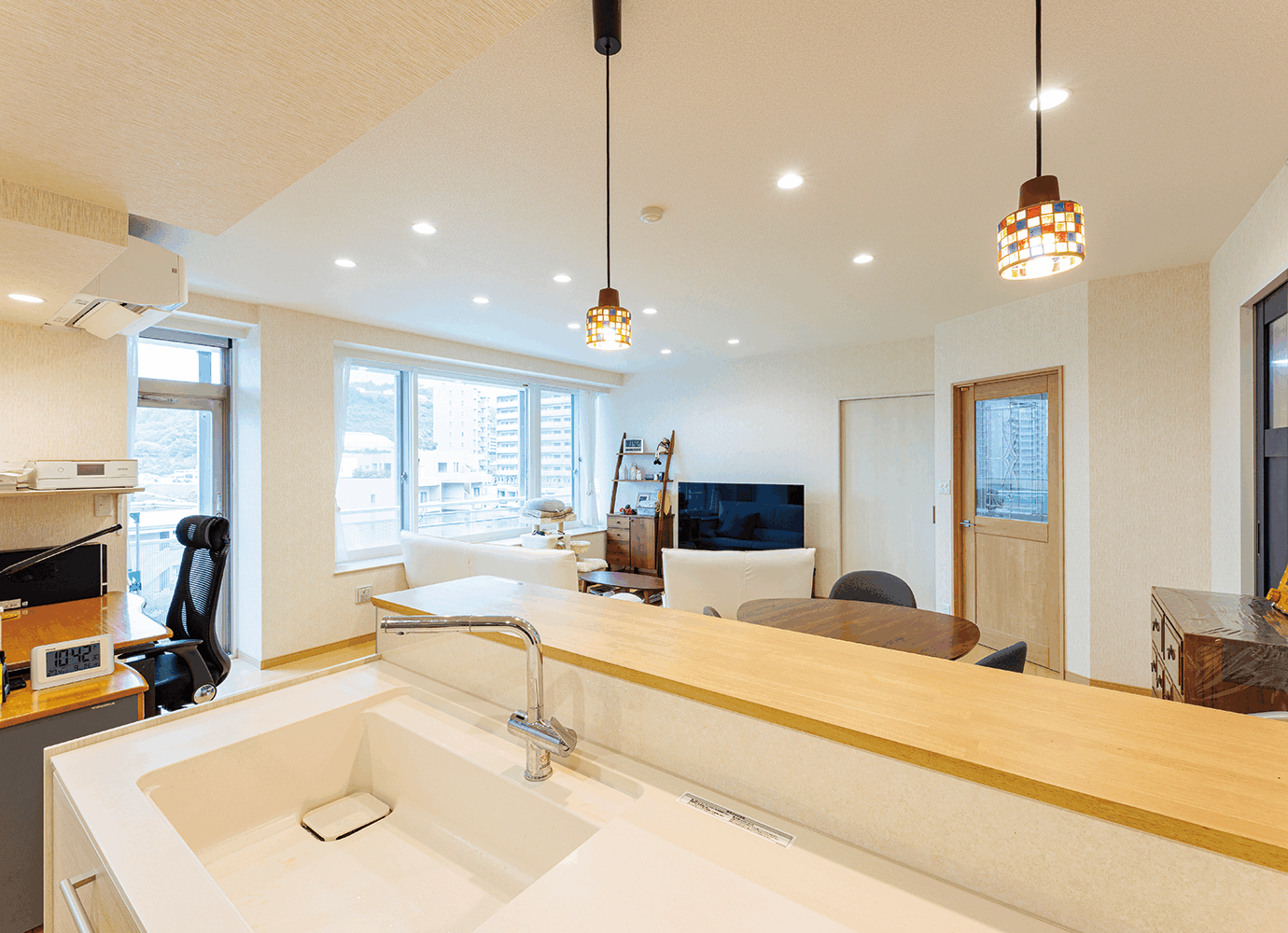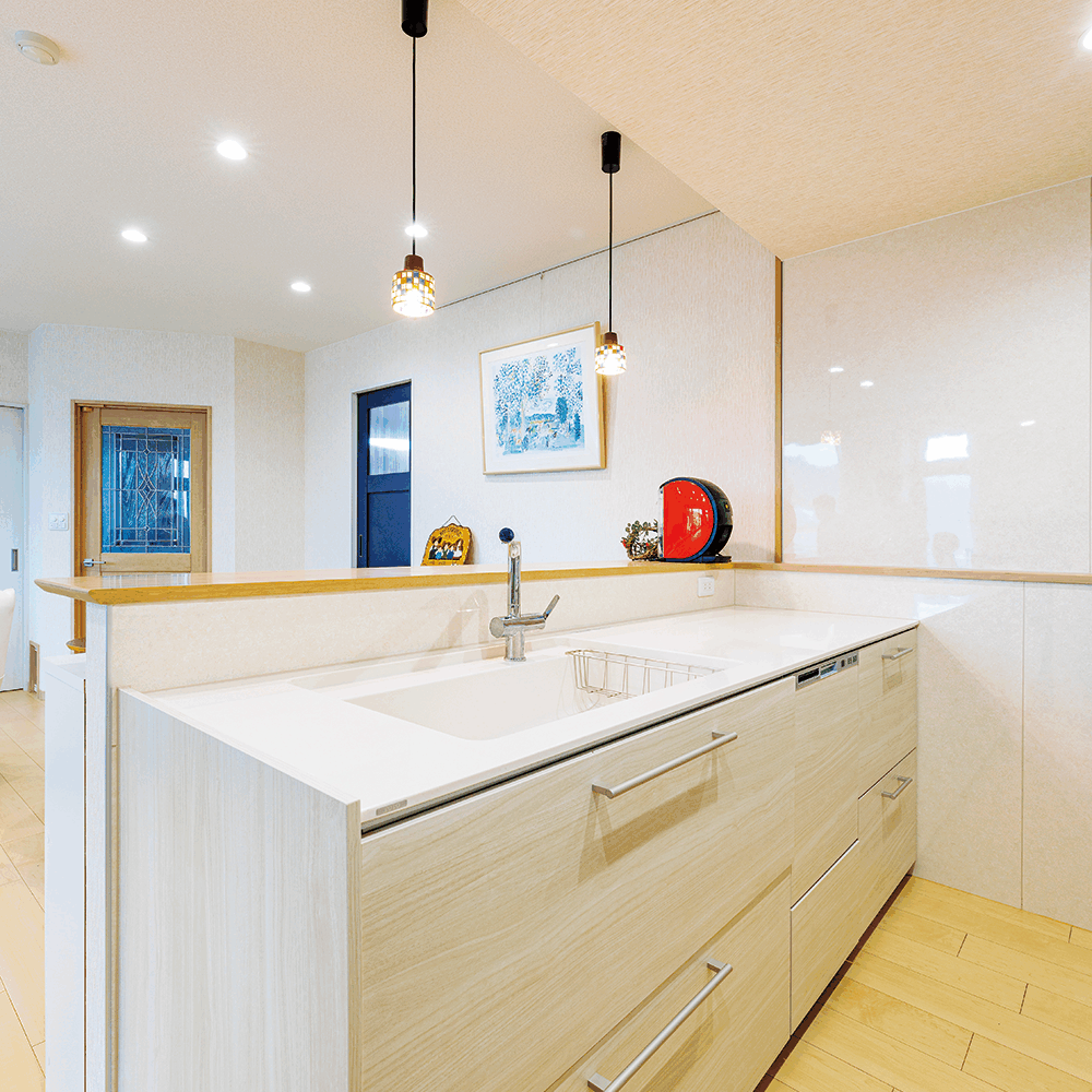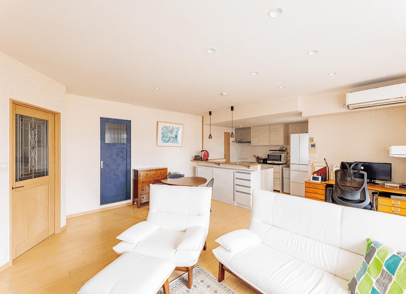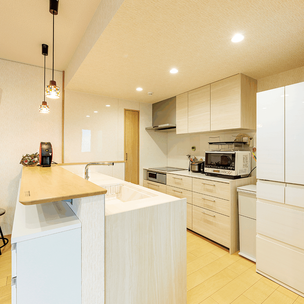 リタイア後の生活も見据えて、夫婦と愛猫の生活をもっと暮らしやすく快適にしたいと考えたU様。長期の仮住まいは猫にストレスがかかるため、2回に分けて動線や間取りを見直し設備や内装を一新しました。和室の一部を取り込んで、広々としたLDに。バルコニーに面した窓面積が広がり、より明るい空間になりました。建具のデザインにもこだわり、リビングドアは大きなステンドグラス入りを、洗面室につながるドアはモールガラス入りのドアを選択。光を取り込むガラスの意匠がインテリアのアクセントにもなっています。夏は暑く、孤立していたキッチンの壁をなくして、LDと一体化。Ⅱ型で対面のレイアウトも実現し、テレビや会話を楽しみながら、快適に家事ができるようになりました。洗面室はLD側に開口部を追加したことで、寝室とLDKを結ぶ通路としても活躍。朝の身支度や洗濯動線も便利になりました。