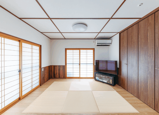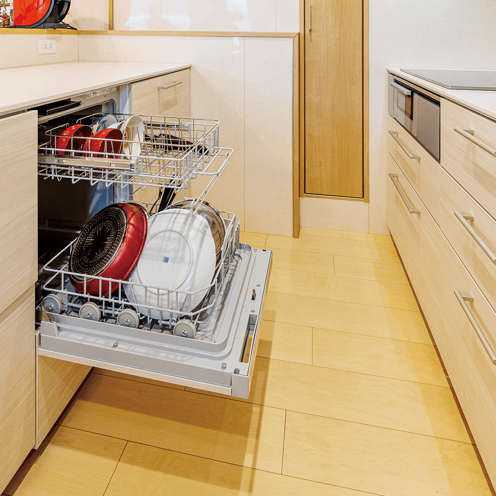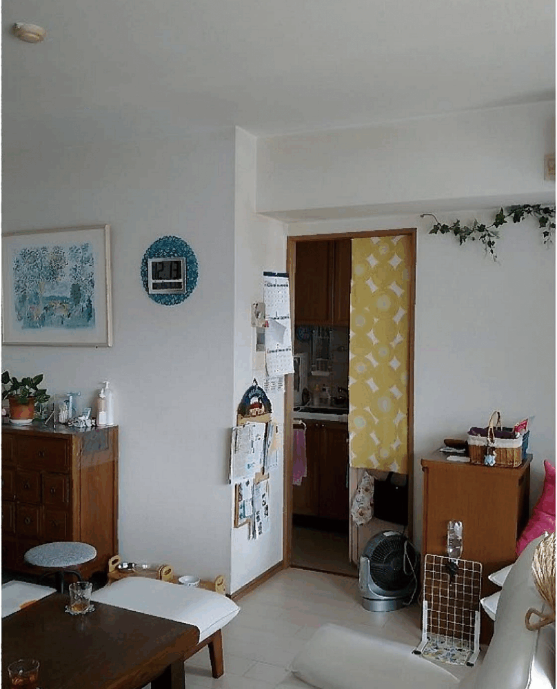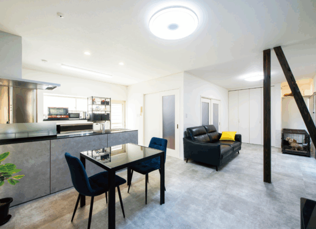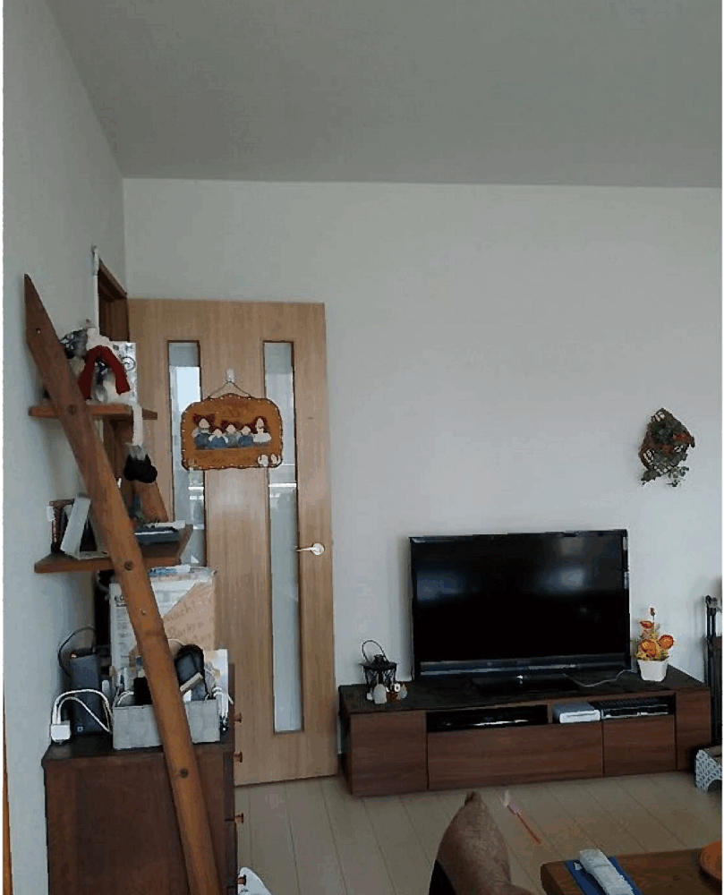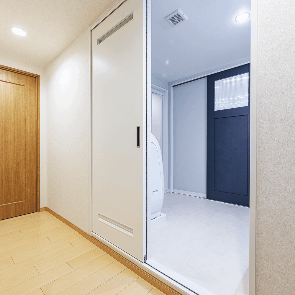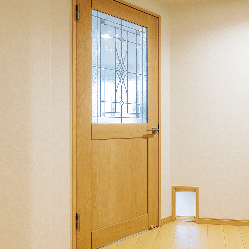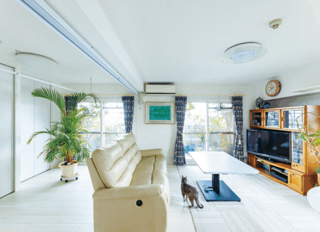 リタイア後の生活も見据えて、夫婦と愛猫の生活をもっと暮らしやすく快適にしたいと考えたU様。長期の仮住まいは猫にストレスがかかるため、2回に分けて動線や間取りを見直し設備や内装を一新しました。和室の一部を取り込んで、広々としたLDに。バルコニーに面した窓面積が広がり、より明るい空間になりました。建具のデザインにもこだわり、リビングドアは大きなステンドグラス入りを、洗面室につながるドアはモールガラス入りのドアを選択。光を取り込むガラスの意匠がインテリアのアクセントにもなっています。夏は暑く、孤立していたキッチンの壁をなくして、LDと一体化。Ⅱ型で対面のレイアウトも実現し、テレビや会話を楽しみながら、快適に家事ができるようになりました。洗面室はLD側に開口部を追加したことで、寝室とLDKを結ぶ通路としても活躍。朝の身支度や洗濯動線も便利になりました。