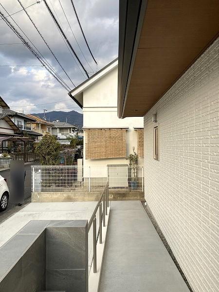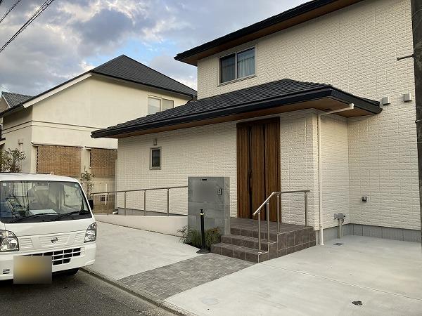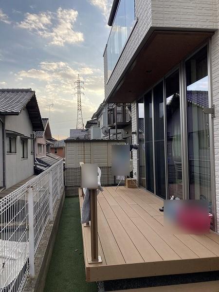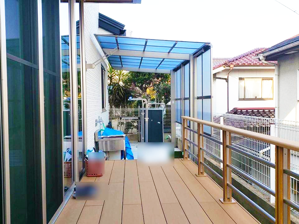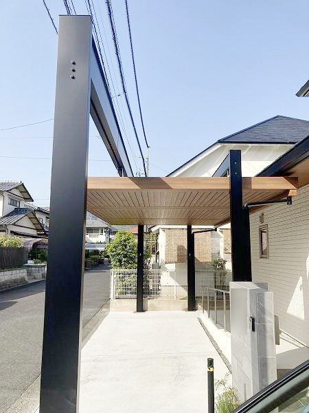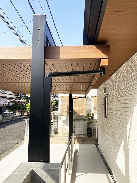 玄関前のスロープから駐車場まで雨に濡れないように、また玄関前に柱が被らないようなカーポートを設置したいというご要望でしたので、最大間口が12mまで対応出来る三協アルミのU.スタイル アゼストをご提案致しました。フラットなデザインで、木調の屋根と黒色のフレームがお家の雰囲気と合っていて、とてもスタイリッシュな仕上がりとなりました。また、勝手口の外には雨よけの為のテラスと、目隠し用のサイドパネルも設置しました。さらにお庭側のウッドデッキ前には同色のウッドフェンスも設置され、リビングから見える隣家も気にならなくなりました。洗濯物を干していたスペースは出幅が少し広かった為、カーポートのネスカFをご採用頂き、天候を気にせず洗濯物を干す事が出来てとても快適!と大変お喜びいただけました。