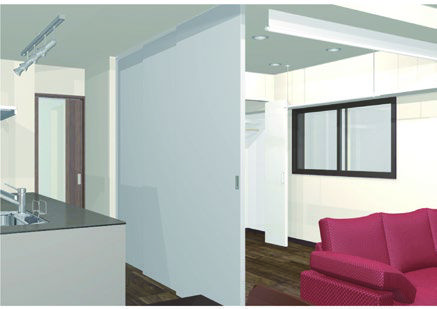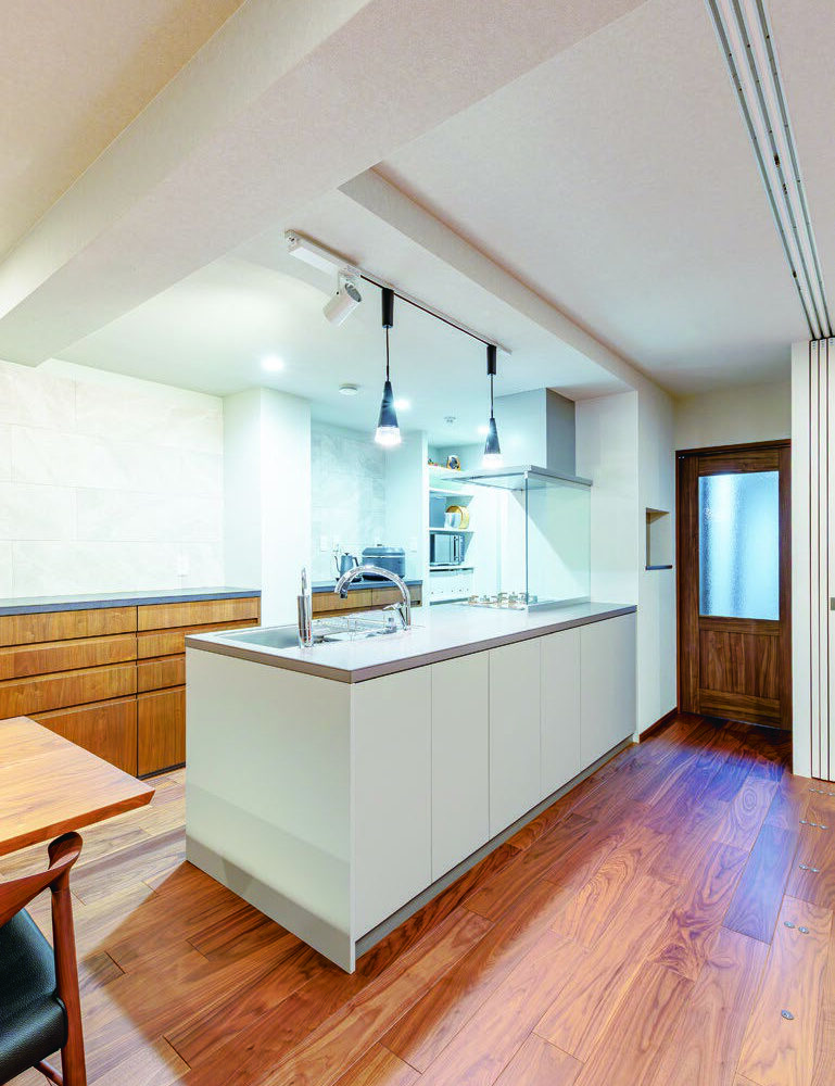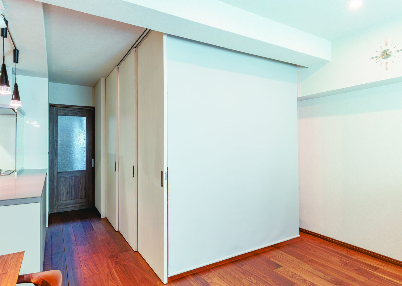 長年悩まされていた結露によるカビと、老化した設備の一新、不便さの解決に、まとめて取り掛かることにしました。独立キッチン、LD、和室に仕切られていた空間をまとめて、広々としたLDKを実現。キッチンを吊り戸棚のないオープンタイプに変え、和室にあった窓からの光や風も行き渡るようにしたことで、より開放的で明るい空間になりました。断熱性能を向上させる内窓 、表面が無垢材の挽き板フローリング、調湿・消臭機能を持つエコカラットの壁で、いつも心地よいくつろぎ空間に。和室があった場所は、引き込み戸とロールスクリーンで間仕切り可能に。普段は開放して広々と使い、必要な時には閉めてプライベート空間として使えるフレキシブルなエリアにしました。
